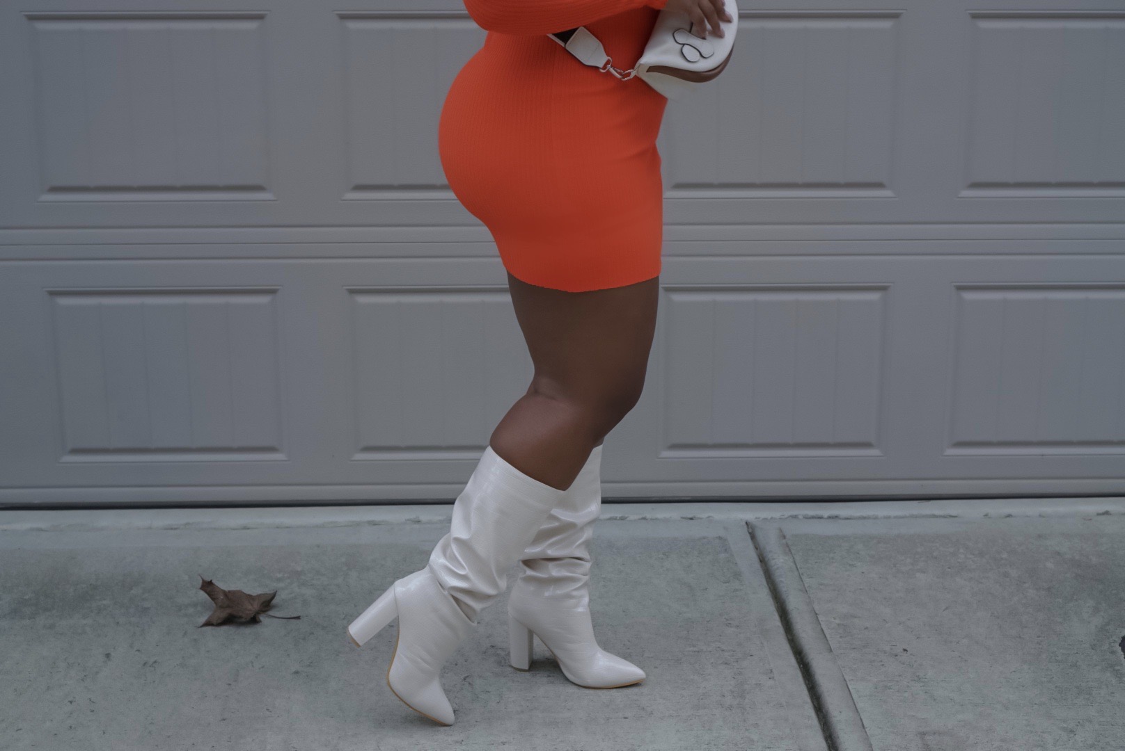 - Keep the dress simple—think knit or sweater dress—because the boots are the statement.