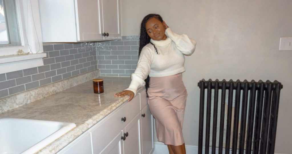 A metallic midi skirt looks like you put effort in—even if you didn’t. Pairing it with a soft sweater tones everything down and keeps it comfortable.